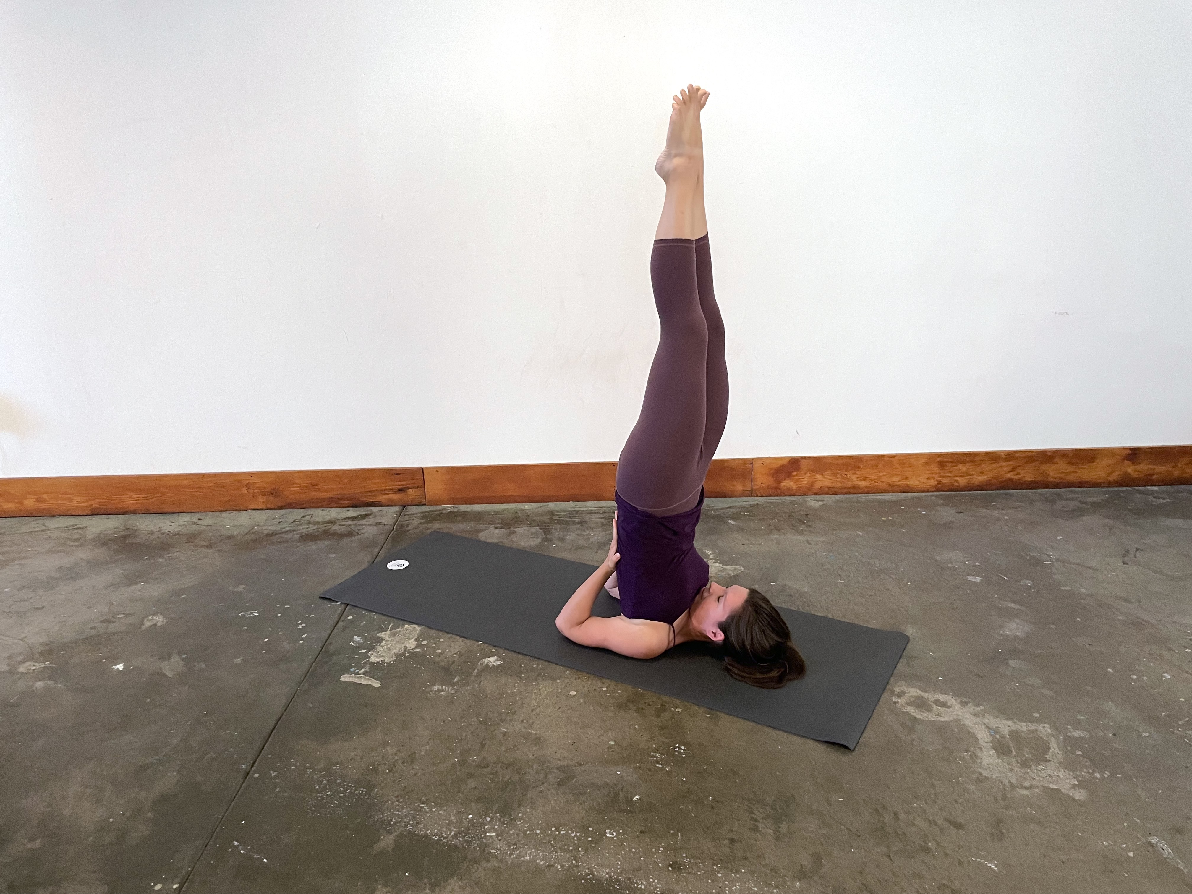 Before you begin the posture, make sure your weight rests in your shoulders in this posture, not your neck vertebrae. Lift the legs upward, supporting the back with your hands. Keep the head still and gaze steady. If desired, you can support your hips with a pillow or block. After some time, if desired, move the legs, taking padmasana or exploring gentle movement.