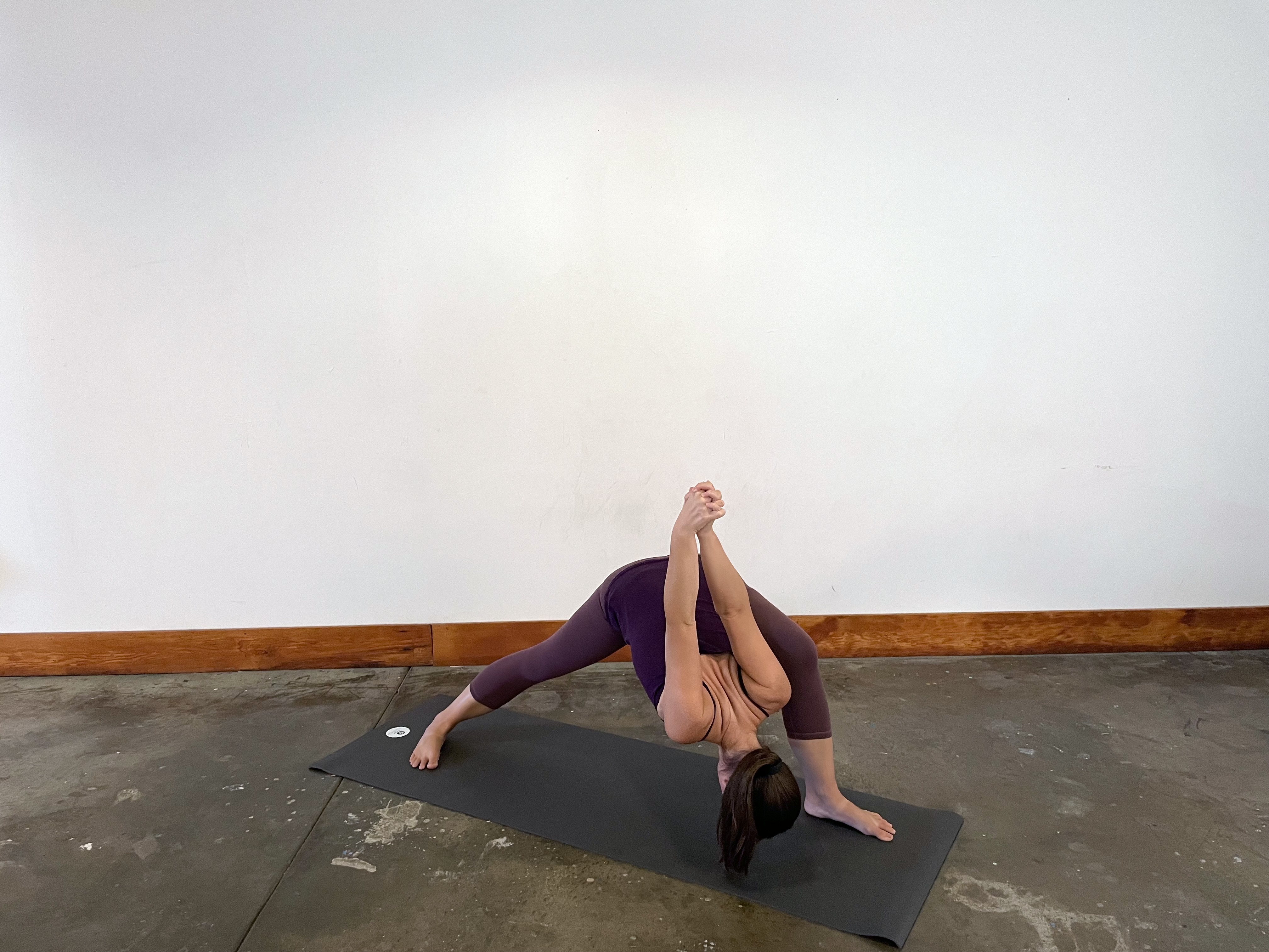 Stand in a lunge position with the back heel grounded (as in warrior one). Clasp your hands or elbows behind your back, and squeeze your shoulder blades together. Bow your head and torso toward the earth while lifting your arms behind you.
